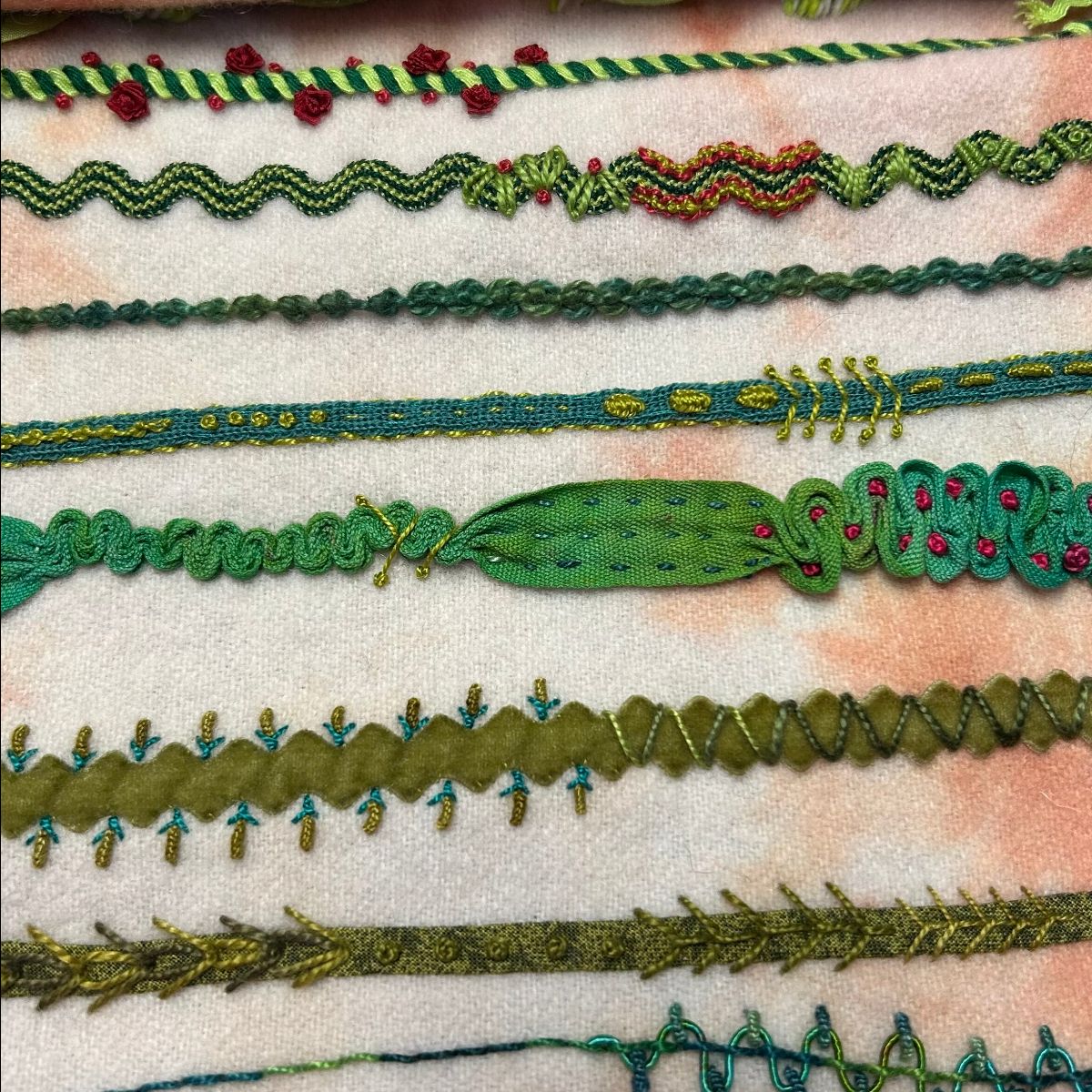Join us to learn a multitude of different ways to create stems for your wool applique projects. Using different techniques, notions, threads and trims we will spend the day learning how to create stems. This is a good class for those looking to add to their Sue Spargo toolbox. Trina took this class with Sue down in her Ohio studio.